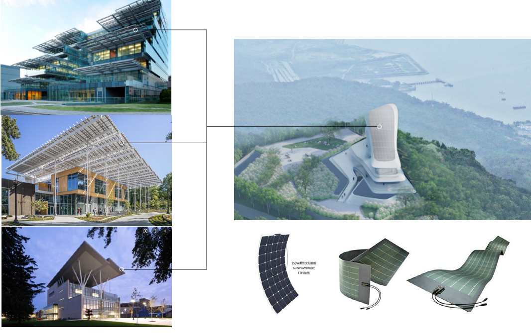 在綠色節(jié)能設(shè)計(jì)方面,建筑屋頂采用柔性太陽(yáng)能光伏發(fā)電板滿鋪模式。綠色低碳,節(jié)能減排,是響應(yīng)國(guó)家減碳降排、綠色節(jié)能的建筑設(shè)計(jì)要求。
