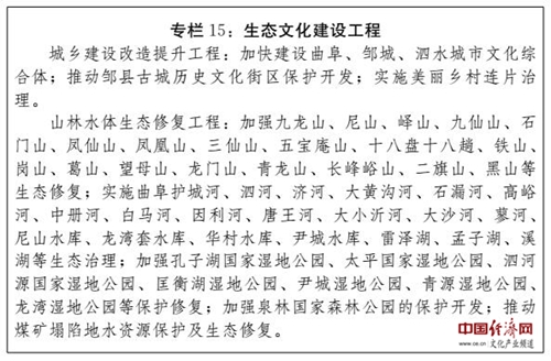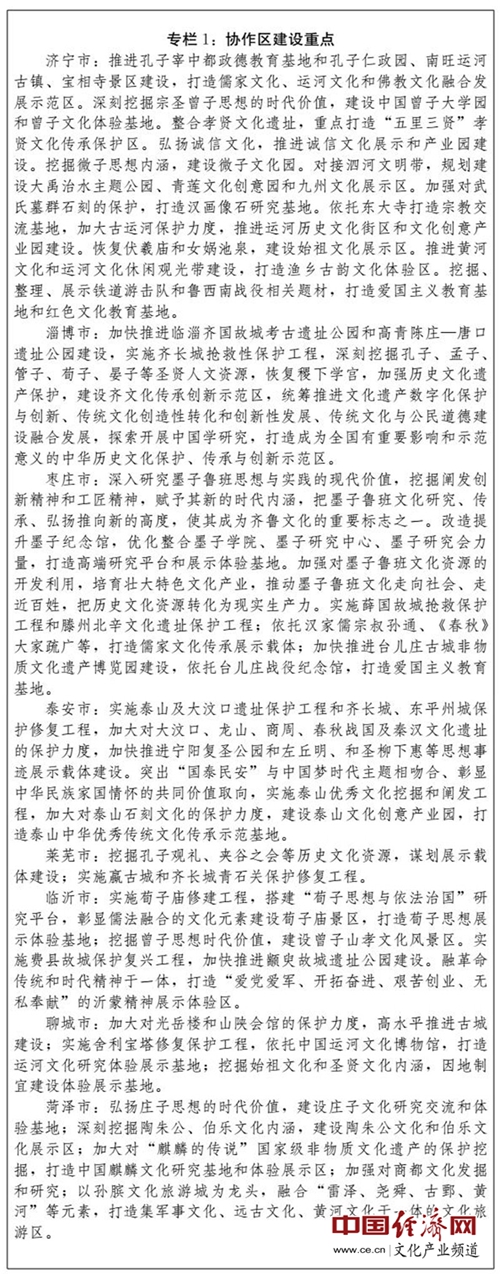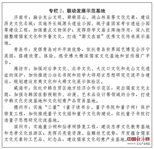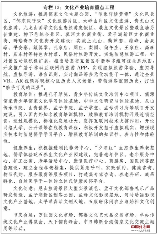 (四)建設(shè)全國文化經(jīng)濟(jì)融合發(fā)展示范區(qū)。充分發(fā)揮文化引領(lǐng)、滲透和支撐作用,系統(tǒng)推進(jìn)文化資源開發(fā),強(qiáng)化文化品牌載體功能,推進(jìn)文化與相關(guān)產(chǎn)業(yè)深度融合,大力發(fā)展文化產(chǎn)業(yè),提升文化產(chǎn)業(yè)園區(qū)、特色基地建設(shè)水平,在更高層次上打造享譽(yù)國內(nèi)外、彰顯儒家文化永恒魅力的旅游休閑圣地、教育培訓(xùn)基地、健康養(yǎng)生福地和文化創(chuàng)意高地。