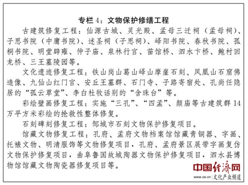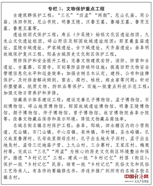 (三)建設(shè)國家記憶工程先行區(qū)。充分發(fā)揮擁有史前文化完整序列和脈絡(luò)清晰文化譜系的優(yōu)勢,加強(qiáng)文化遺產(chǎn)及大遺址保護(hù),做好古建筑、古遺址的文物本體維修,實(shí)施搶救性保護(hù)、預(yù)防性保護(hù)和科學(xué)修復(fù)工程;加強(qiáng)文物資源系統(tǒng)梳理、典籍文獻(xiàn)搜集整理編纂保護(hù),建設(shè)儒家文化資源數(shù)據(jù)庫;擴(kuò)大文物資源對公眾的開放度,推動博物館文創(chuàng)產(chǎn)品開發(fā),建設(shè)全國文化遺產(chǎn)保護(hù)利用示范區(qū),在實(shí)施國家記憶工程進(jìn)程中走在前列。