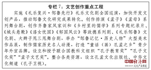 (四)打造儒藝創(chuàng)意文化產(chǎn)業(yè)基地。以曲阜新區(qū)國家級文化產(chǎn)業(yè)示范區(qū)和孟子湖新區(qū)為重點(diǎn),突出創(chuàng)意文化環(huán)節(jié)的開發(fā)和拓展,推動創(chuàng)意文化產(chǎn)業(yè)與其他產(chǎn)業(yè)的相互滲透和融合發(fā)展,建設(shè)具有儒家特色的創(chuàng)意文化產(chǎn)業(yè)集群。依托文化文物單位館藏文化資源,充分采用數(shù)字化、信息化技術(shù),研發(fā)推出工藝精良、制作精美的文物創(chuàng)意產(chǎn)品、旅游紀(jì)念品和衍生創(chuàng)意產(chǎn)品,促進(jìn)文化創(chuàng)意產(chǎn)品創(chuàng)新發(fā)展。大力發(fā)展以儒家文化品牌為主導(dǎo)的動漫產(chǎn)業(yè),積極加強(qiáng)基于虛擬現(xiàn)實(shí)技術(shù)的原創(chuàng)動漫游戲產(chǎn)品創(chuàng)作,構(gòu)建高端動漫、網(wǎng)絡(luò)游戲產(chǎn)業(yè)發(fā)展體系。積極推動與儒家文化品牌動漫有關(guān)的圖書、報(bào)刊、音像制品的發(fā)行出版,引導(dǎo)企業(yè)開發(fā)生產(chǎn)衍生產(chǎn)品。積極采用全景環(huán)繞、虛擬現(xiàn)實(shí)等技術(shù),創(chuàng)作一批影視精品、舞臺劇、音樂劇,打造高品質(zhì)旅游實(shí)景演藝產(chǎn)品,再現(xiàn)孔孟形象,反映儒學(xué)思想對人類文明的貢獻(xiàn)、春秋戰(zhàn)國時代的社會變革;積極加強(qiáng)與中央和省市各級電視臺、影視制作單位和網(wǎng)絡(luò)媒體的戰(zhàn)略合作,爭取建設(shè)影視基地。