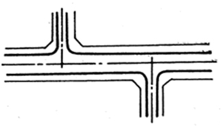兩條道路垂直或近似垂直相交;其形式簡單,交通組織方便,街角建筑易于處理,適用范圍廣,是最基本的交叉口形式。