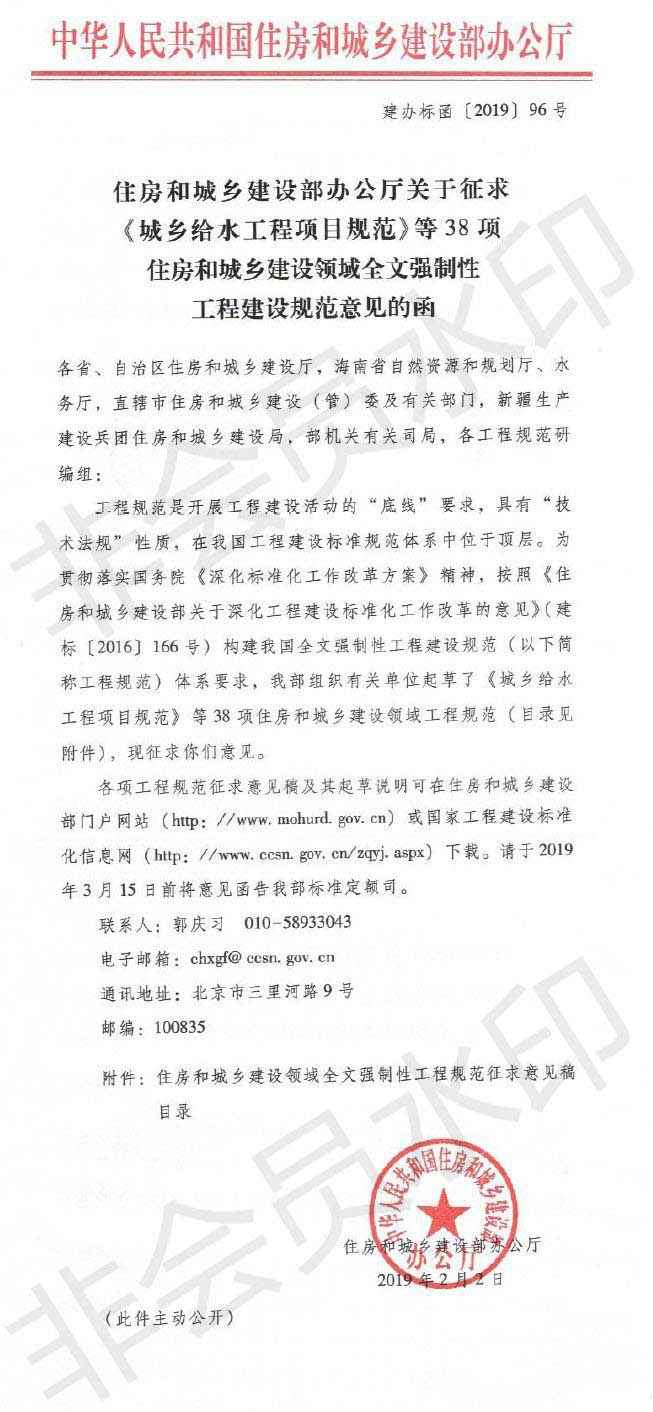日前,住房和城鄉建設部辦公廳發布《關于征求<城鄉給水工程項目規范>等38項住房和城鄉建設領域全文強制性工程建設規范意見的函》,公布了《建筑和市政工程防水通用規范》征求意見稿。