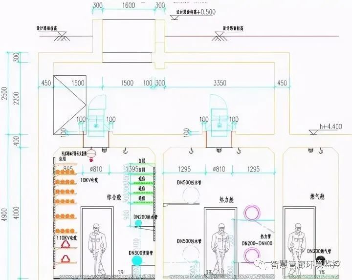 管廊的通風(fēng)機(jī)房一般利用管廊上方的空間設(shè)置,同時(shí)考慮到相交管線的穿越,管廊頂部覆土深度一 般為2.5-3.0m。這樣的做法導(dǎo)致起點(diǎn)的雨污水支管標(biāo)高與管廊就不能匹配。但是,管廊的覆土深度并不是只有2.5-3.0m,在特殊情況下,滿足抗浮 的 前提下,將管廊覆土減少至1.5m,此時(shí),進(jìn)排風(fēng)井可采用外掛式,滿足通風(fēng)需求,同時(shí)結(jié)合雨污水標(biāo)高,甚至將起點(diǎn)雨污水管道納入綜合管廊。