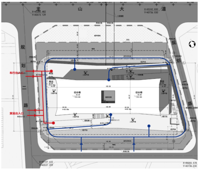 ②商業(yè)及三層辦公流線:由南北兩側(cè)主入口經(jīng)過入口大廳進入首層,通過豎向交通,通往商業(yè)及三層辦公各層;也可以通過兩個室外坡道先上至二層平臺再通過二層入口大廳進入二層。