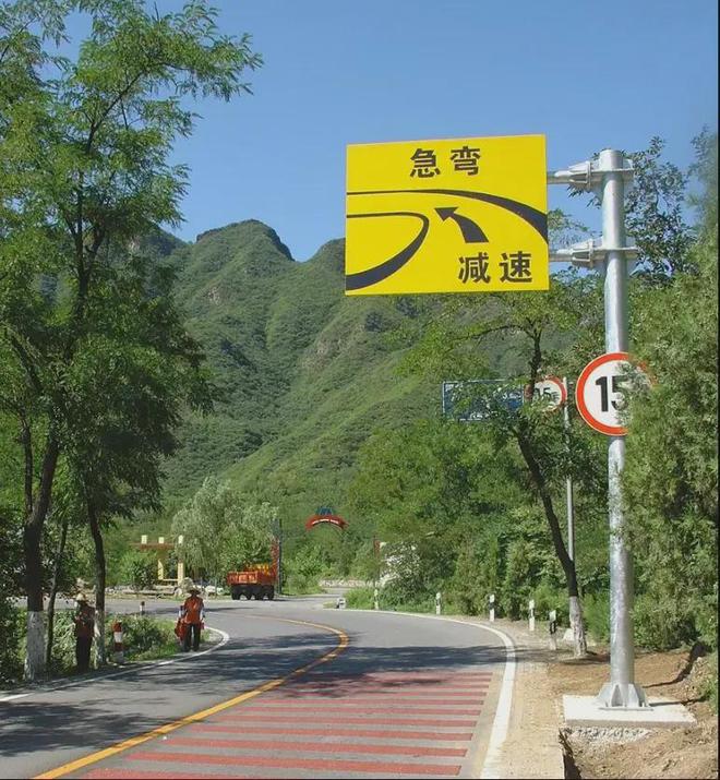 研究表明,在困難的視覺(jué)條件下(如低亮度、快速顯示),圖形符號(hào)信息因其具有直觀性的特點(diǎn),無(wú)論在辨認(rèn)速度還是在辨認(rèn)距離上均優(yōu)于文字信息。用圖形符號(hào)來(lái)表示信息的另一優(yōu)點(diǎn)是不同國(guó)家、不同民族、不同語(yǔ)言文字的駕駛?cè)司煽焖倮斫夂驼J(rèn)讀。因此,以圖形符號(hào)為主的交通標(biāo)志在世界上絕大多數(shù)國(guó)家被廣泛采用。圖2為國(guó)內(nèi)公路上設(shè)置的“急彎減速”標(biāo)志和著名地點(diǎn)標(biāo)志示例。