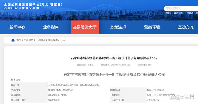 石家莊市城市軌道交通4號線一期工程設(shè)計總承包中標(biāo)候選人公示