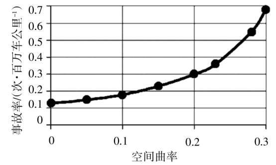在開(kāi)展公路路線(xiàn)設(shè)計(jì)安全性評(píng)價(jià)中,為了提高設(shè)計(jì)的合理性,還要構(gòu)建完善的系統(tǒng)分析和評(píng)價(jià)模型,主要包括行車(chē)安全事故發(fā)生概率與空間曲率指標(biāo)模型的評(píng)價(jià)。及時(shí)通告公路實(shí)際情況,結(jié)合現(xiàn)代公路安全角度進(jìn)行評(píng)價(jià),明確公路線(xiàn)路設(shè)計(jì)項(xiàng)目的完整性搜集,同時(shí)構(gòu)建完善的模型曲線(xiàn)關(guān)系,相關(guān)專(zhuān)業(yè)人士的空間曲率和安全事故發(fā)生率直接的曲線(xiàn)關(guān)系如圖1所示。