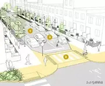 此外,在居住區或是有路側停車的城市支路,可將交叉口進行縮窄設計,以減小行人過街距離,進一步降低車輛轉彎速度、保障行人安全。