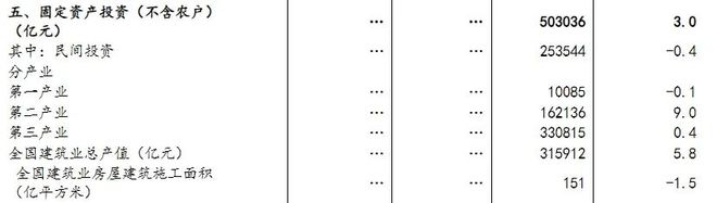分產(chǎn)業(yè)看,第一產(chǎn)業(yè)投資10085億元,比上年下降0.1%;第二產(chǎn)業(yè)投資162136億元,增長(zhǎng)9.0%;第三產(chǎn)業(yè)投資330815億元,增長(zhǎng)0.4%。