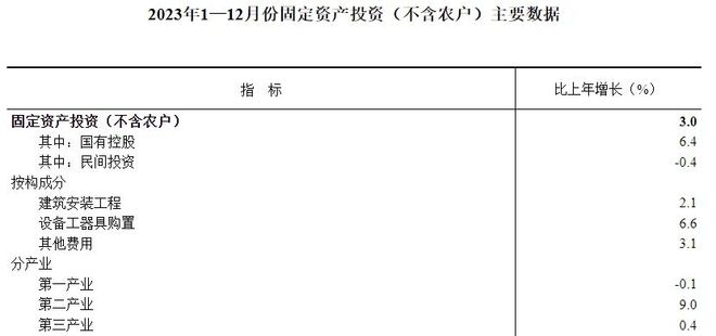 2023年,全國(guó)固定資產(chǎn)投資(不含農(nóng)戶)503036億元,比上年增長(zhǎng)3.0%(按可比口徑計(jì)算),增速比1—11月份加快0.1個(gè)百分點(diǎn)。其中,制造業(yè)投資增長(zhǎng)6.5%,增速加快0.2個(gè)百分點(diǎn);基礎(chǔ)設(shè)施投資(不含電力、熱力、燃?xì)饧八a(chǎn)和供應(yīng)業(yè))增長(zhǎng)5.9%,增速加快0.1個(gè)百分點(diǎn)。從環(huán)比看,12月份固定資產(chǎn)投資(不含農(nóng)戶)增長(zhǎng)0.09%。2023年,民間固定資產(chǎn)投資253544億元,比上年下降0.4%,降幅比1—11月份收窄0.1個(gè)百分點(diǎn)。