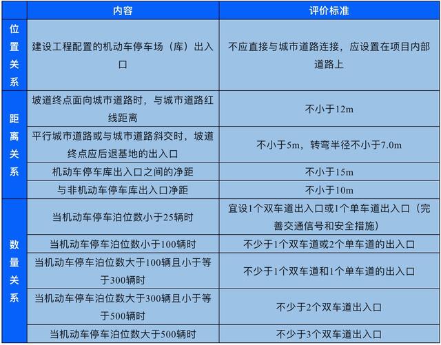 建設(shè)工程出入口與機(jī)動(dòng)車停車場(chǎng)(庫(kù))出入口評(píng)價(jià)主要內(nèi)容及標(biāo)準(zhǔn)如下。