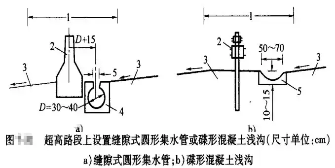 (1)寬度小于3m且表面采用鋪面封閉的中央分隔帶排水,降落在分隔帶上的表面水排向兩側(cè)行車道,其坡度與路面的橫坡度相同;在超高路段上,可在分隔帶上側(cè)邊緣處設(shè)置緣石或泄水口,或者在分隔帶內(nèi)設(shè)置縫隙式圓形集水管或碟形混凝土淺溝和泄水口,以攔截和排泄上側(cè)半幅路面的表面水。緣石過(guò)水?dāng)嗝娴男顾诳刹捎瞄_口式,格柵式或組合式;碟形混凝土淺溝的泄水口采用格柵式。