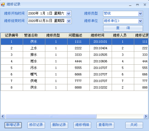 4.對各種管線的維護信息做到及時統(tǒng)計,使管理人員能及時掌握管線的運行情況,對管線進行動態(tài)維護和管理。 實現(xiàn)各種管線管理維護的績效分析(質(zhì)量、效率、成本)。